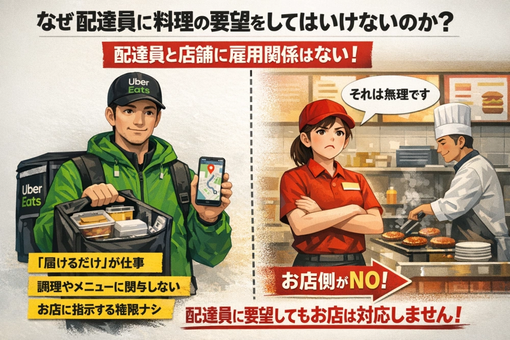 ウーバーイーツでは、配達員は「料理を運ぶ役割」に特化した存在であり、店舗のスタッフではありません。